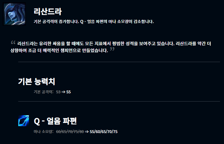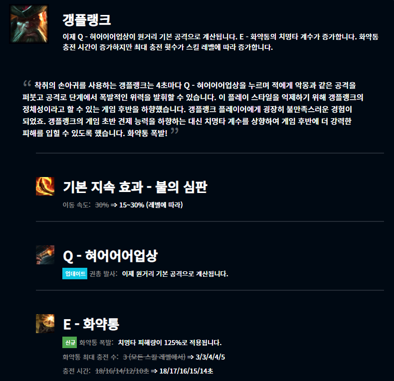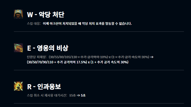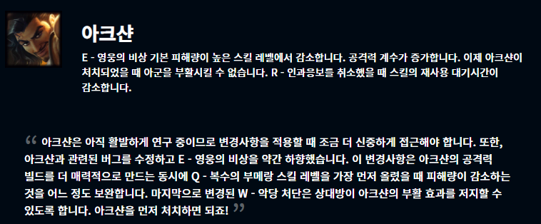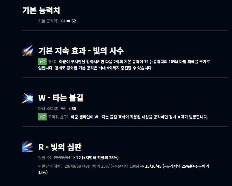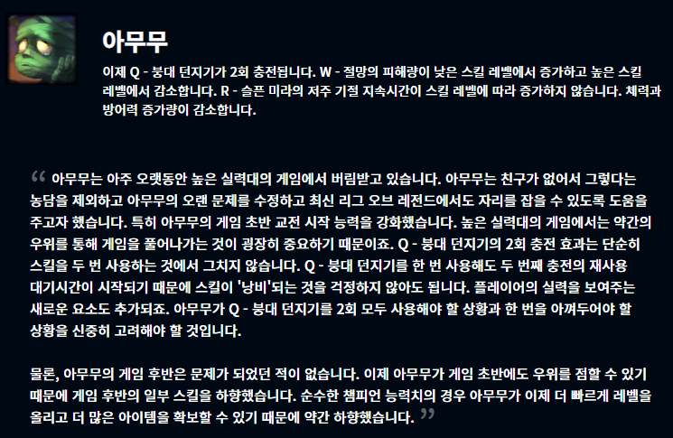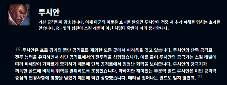 아크샨은 아직 출시된지 얼마 되지 않은 챔피언이라 변경한 것 같고 아무무의 경우 확실하게 버프쪽인 방향이네요. 갱플랭크의 경우 전체적으로 너프된 느낌이며 루시안의 경우 서폿과 함께 원딜 라인을 가는 경우 얻는 이점이 많아졌습니다. 탑이나 미드 루시안 말고 원딜로 쓰라는 그런 느낌이네요.