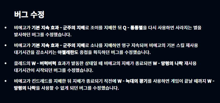 일단 간단하게 확인해보면 이번 11.17 패치에서는 비에고, 그레이브즈, 이렐리아, 레오나, 케인, 제드가 너프를 당했고 티모, 이블린, 나미, 에코, 리산드라, 세나, 자야가 버프되었습니다. 그 외에 아크샨, 갱플랭크, 아무무, 루시안이 변경점이 있으며 룬은 정밀의 기민한 발놀림이 변경되었고 아이템은 요우무의 유령검, 선체파괴자, 신성한 파괴자, 마법사의 최후, 독사의 송곳니가 변경점이 있습니다. 세부적으론 어떤 점이 어떻게 변경되었을까요?
