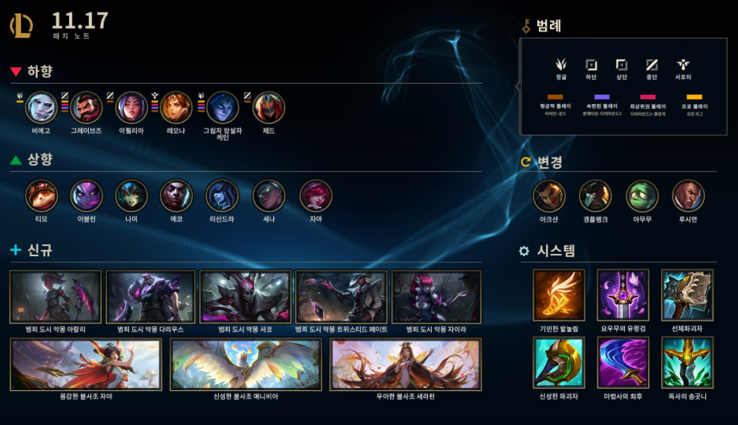 최근 들어서 새롭게 롤 11.17 패치가 적용되었습니다. 그렇다면 이번 패치에서는 어떤 챔피언들이 너프를 당하고, 또 어떤 챔피언들이 버프되었으며 거기에 변경된 챔피언들은 어떤게 있는지, 또 아이템과 룬 변경점은 어느게 있는지 11.17 패치노트를 알아보도록 합시다.