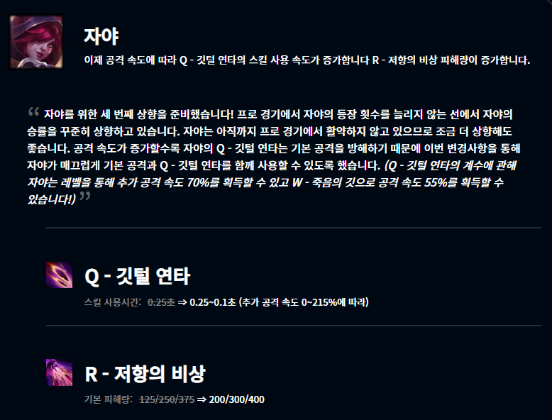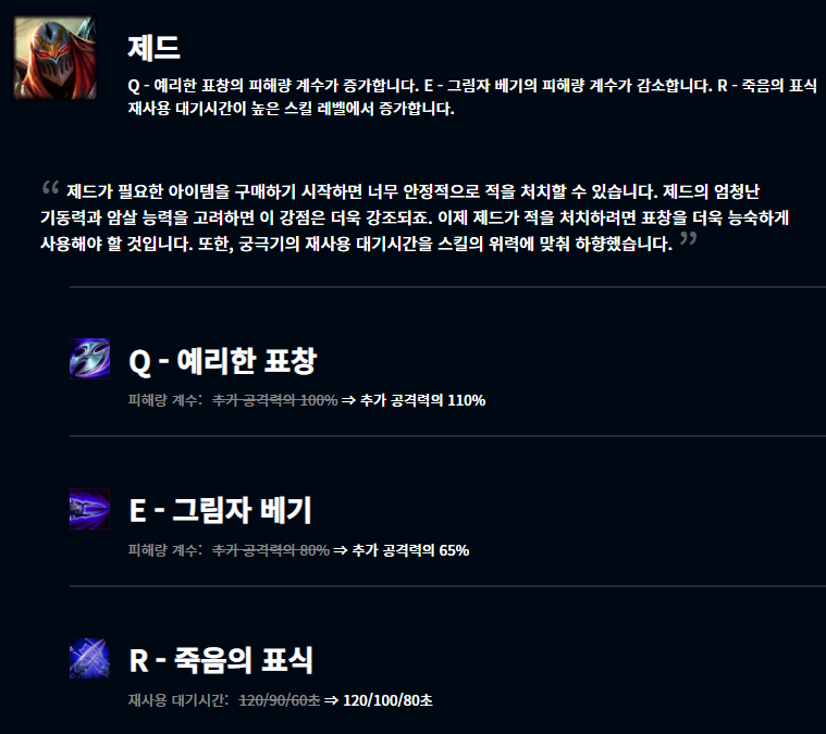 제드와 이렐리아가 버프를 당했네요. 이 두 챔피언은 각각 미드, 탑에서 굉장한 활약을 보이고 있기에 어느 정도 너프가 필요했습니다. 예정된 너프라고 할 수 있죠. 제드의 경우 표창의 공격력은 올랐지만 궁극기 쿨타임을 늘리고 E스킬 계수를 크게 너프하여 표창을 얼마나 잘 맞추느냐가 핵심이 되었습니다.