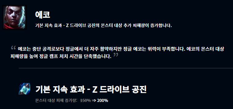 확실히 잘 안쓰이는 챔피언들이 버프를 당했습니다. 특히 정글 에코의 경우 정글링 능력을 향상시킨 것으로 상당한 수요가 예상되며 그 외에는 큰 변경 없이 그냥 간단하게 수치만 살짝 조정한 느낌입니다.