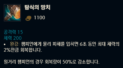 선체파괴자의 하위 아이템은 곡괭이와 탐식의 망치입니다. 탐식의 망치로 공격력과 체력, 그리고 곡괭이로 공격력을 제공해주기 때문에 딜로스 구간이 없으며 거기에 챔피언과의 교전에 있어서도 도움을 주죠.