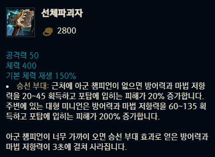 선체파괴자의 기본 옵션은 공격력 50, 체력 400, 기본 체력 재생 150%의 옵션을 가지고 있습니다. 거기에 승선 부대라는 근처에 아군 챔피언이 없는 경우 추가 방어력과 마법 저항력 획득 및 포탑에 가하는 피해가 20% 증가하죠. 그뿐만 아니라 근처 대포 미니언 역시 더욱 강해집니다. 하지만 주변에 아군 챔피언이 있으면 효과가 사라지기 때문에 혼자 묵묵히 스플릿푸쉬를 하는 챔피언에게 어울리는 것이죠.