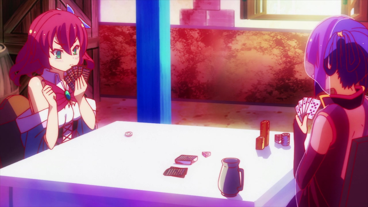 마을에는 국왕 자리를 걸고 게임을 진행중인 두 소녀가 있었으며 주인공 공백은 파란 머리 여자애가 뭔가 속임수를 쓰고 있다는 것을 깨닫습니다. 다만, 어떠한 속임수인지는 밝혀내지 못했으며 분홍머리 여자애 옆을 지나가면서 상대는 사기를 쓰고 있다고 귓속말로 전해주고 그대로 쉬러 올라갑니다.