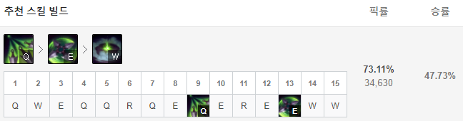 스킬의 경우 처음 3레벨에는 Q, W, E 스킬을 하나씩 찍어주고 이후부터는 R-Q-E-W 순서로 스킬을 마스터해줍니다. Q스킬이 쿨타임도 짧고 딜링도 괜찮기 때문에 먼저 마스터해주는 것입니다. W스킬의 경우 먼저 마스터해도 딜링이 늘어나는 것도 아니며 별로 기대치가 낮기 때문에 마지막에 마스터해주는 것이구요.