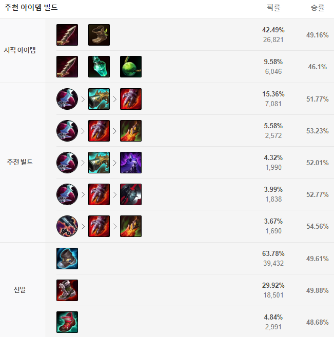 시작 아이템으로 톱날 단검과 신발을 구매해주시고 첫 번째 코어 아이템으로는 월식을 선택해줍니다. 이후 상대 챔피언들을 보고 AP가 강하면 헤르메스의 발걸음을, AD가 강하면 판금 장화를 올려준 후 징수의 총과 스테락의 도전을 올려줍니다. 여기까지 완성되었으면 그 다음은 상황을 보고 딜이 더 필요하면 칠흑의 양날도끼를, 너무 빨리 녹는 것 같으면 죽음의 무도를, 상대의 CC기가 너무 많으면 밤의 끝자락을 올려줍니다.