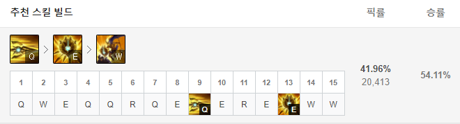 처음 시작 3레벨에는 Q, W, E 스킬을 하나씩 찍어주고 이후 4레벨부터는 R-Q-E-W 순서로 스킬을 마스터해줍니다. Q스킬을 먼저 마스터해주는 이유는 칼바람 나락 특성상 항상 서로 견제를 하기 때문에 판테온 역시 견제를 위해 충전해서 사용하면 원거리 스킬이 되는 Q스킬을 먼저 올리는 것입니다.