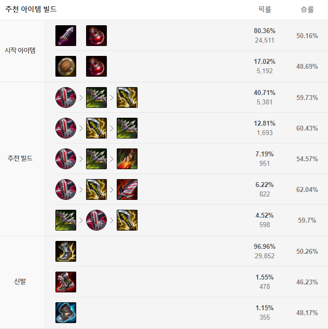 시작 아이템은 도란의 검과 포션 한 개로 시작해줍니다. 이후 첫 번째 코어 아이템으로 불멸의 철갑궁을 올려줍니다. 불멸의 철갑궁은 야스오의 생존률을 크게 올려주고 아래에서 말할 정복자 룬과 시너지가 좋죠. 이후 광전사의 군화를 올려준 뒤 필멸자의 운명과 무한의 대검을 올리는게 보통 템트리입니다. 그 다음부터는 상황을 보고 피바라기, 죽음의 무도, 수호천사 등을 올려주시면 되겠습니다.