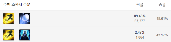 먼저 스펠입니다. 칼바람 나락 초가스는 점멸과 눈덩이를 들어주는데요, 눈덩이 이외에 스킬이 별로 그렇게 효과를 못보고 그렇기 때문에 딸피인 적을 눈덩이로 맞춰서 바로 들어가 궁극기로 먹어버리는 그런 연계들을 위해 눈덩이를 들어줍니다.