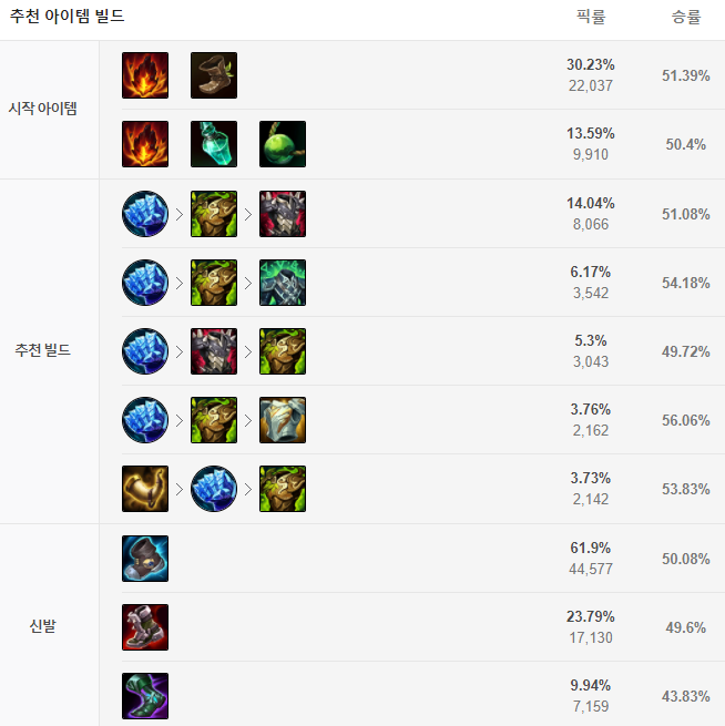 템트리의 경우 처음 시작으로 바미의 불씨와 신발을 구매해주시는게 제일 무난합니다. 그 다음에는 첫 코어 아이템으로 서리불꽃 건틀릿을 가주고 상대팀에 AP가 많으면 헤르메스의 발걸음을, AD가 많으면 판금 장화를 올려주세요. 이후에는 워모그의 갑옷을 띄워준 뒤 상황을 보고 상대 AP가 쎄면 정령의 형상을, AD가 쎄면 가시 갑옷을, 둘 다 비등비등하면 가고일 돌갑옷을 올려주시면 되겠습니다.