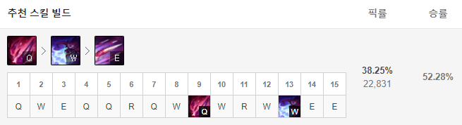 처음 3렙에는 Q, W, E 스킬을 하나씩 찍어주시고 이후부터는 R-Q-W-E 순서로 스킬을 마스터해주면 되겠습니다. Q스킬이 적을 띄우는 CC기이기도 하고 딜링도 나쁘지 않은 편이라 먼저 마스터해주는 것이죠. 또한 궁극기를 배우고 나서 팁은 궁극기로 너무 챔피언만 잡으려 하지 말라는 것입니다. 초가스의 궁극기는 미니언을 상대로도 사용할 수 있으며 그렇게 사용해도 크기가 6번까지는 커지기 때문에, 각이 안나오면 미니언 스택을 먼저 쌓는게 좋습니다.