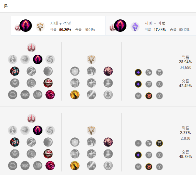 칼바람 베이가 룬은 지배에서 어둠의 수확 룬을 메인 룬으로 사용합니다. 안그래도 강력한 베이가의 딜링을 더더욱 강력하게 해주는 룬이며 하위 룬으로는 E스킬과 연계가 좋은 비열한 한 방과 사냥의 증표, 궁극의 사냥꾼을 들어줍니다. 보조룬으로는 정밀의 침착과 최후의 일격을 들어주고요.