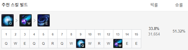 베이가는 처음 시작 3레벨에는 Q, W, E 스킬을 하나씩 찍어준 뒤 4레벨부터는 R-Q-W-E 순서로 스킬을 마스터해줍니다. 궁극기를 제외하고 Q스킬을 선마하는 이유는 제일 쿨타임이 짧으며 딜링도 상당한 원거리 스킬이기 때문이죠. E스킬을 마지막에 마스터하는 이유는 공격 스킬이 아닌 CC기이기 때문입니다.