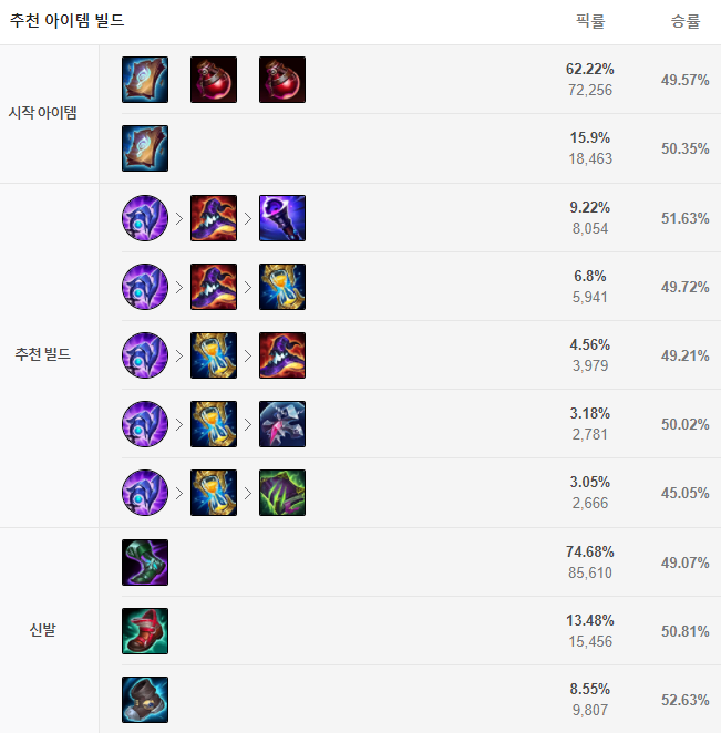 칼바람 베이가 템트리는 처음엔 사라진 양피지와 포션 두 개로 시작해줍니다. 이후 첫 코어 아이템으로 루덴의 폭풍을 올려주시고 마법사의 신발을 올려준 뒤 바로 라바돈의 죽음 모자를 올려줍니다. 베이가의 패시브 스킬로 스택이 계속해서 쌓이고, 그렇게 쌓이면 주문력이 올라가기 때문에 라바돈의 죽음 모자와 굉장히 잘 어울리죠. 여기까지 올린 뒤에는 상황을 보고 딜이 더 필요하면 공허의 지팡이를, 암살자들한테 계속 물린다면 존야의 모래시계를, 상대팀에 흡혈, 회복 챔피언이 많으면 모렐로노미콘을 올려주시면 됩니다.