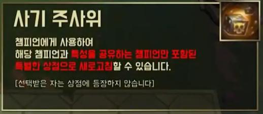 먼저 롤토체스에서 사기 주사위는 챔피언에게 사용하는 것인데, 사용하게 되면 해당 챔피언과 특성을 공유하는 챔피언만 포함된 특별한 상점으로 새로고침이 됩니다. 시즌 4.5에서 새롭게 등장한 아이템으로 예를 들어 그라가스(빛의 인도자, 싸움꾼)에게 사용한다고 치면 상점이 빛의 인도자 챔피언들, 싸움꾼 챔피언들만 등장하는 상점으로 새로고침 된다는 것이죠.