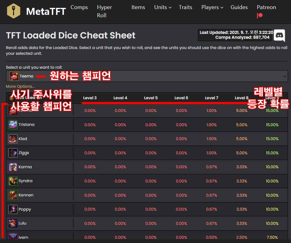 먼저 https://www.metatft.com/loaded-dice 사이트를 들어가줍니다. 위와 같은 화면이 나올텐데 거기에서 뽑고 싶은 챔피언을 선택해주시면 자동으로 어떤 챔피언에게 사기 주사위를 사용해야하는지, 그리고 플레이어가 몇 레벨에 사용하는지에 따른 확률이 정리되어 나옵니다. 예를 들면 현재 8레벨인 상황에서 티모를 찾는 경우 카르마나 신드라, 케넨에 사기주사위를 사용하는 것 보다는 클레드, 직스, 트리스타나, 티모에게 사기주사위를 사용하는게 더 낫겠죠?