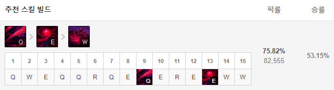 먼저 처음 3레벨 시작에는 Q, W, E스킬을 하나씩 찍어주고 4레벨부터는 R-Q-E-W 순서로 스킬을 마스터해주시면 되겠습니다. 궁극기를 제외하고 Q스킬을 제일 먼저 마스터해주는 이유는 제일 쿨타임도 짧으며 블라디의 밥줄 스킬이기 때문이죠.