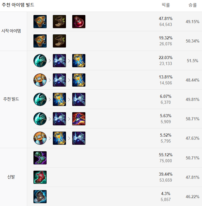 처음 시작은 마법공학 교류 발전기와 신발, 포션 하나로 시작해줍니다. 이후 첫 코어 아이템으로 밤의 수확자를, 그리고 마법사의 신발을 올려주세요. 그 이후에는 우주의 추진력과 존야의 모래시계를 올려주시면 됩니다. 이게 보통 템트리이고 만약 상대팀이 회피기가 굉장히 많은 챔피언인 경우 마법공학 로켓 벨트를 첫 코어 아이템으로 올리는 것도 괜찮은 방법입니다.
