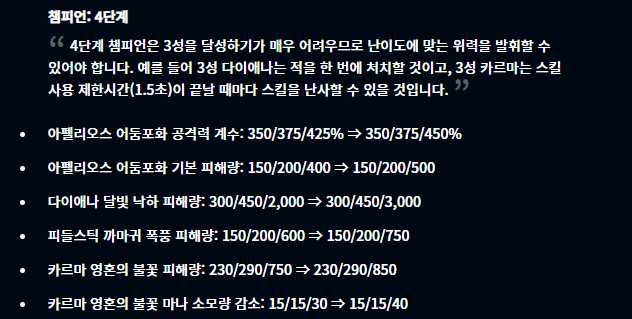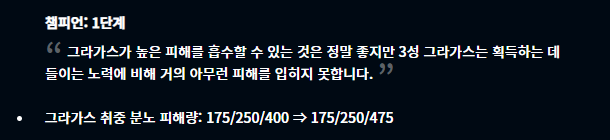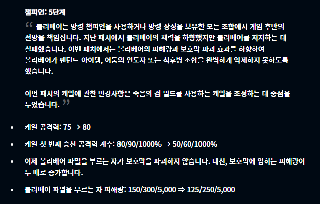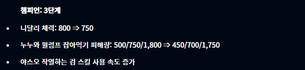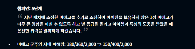 아이템 부분은 뭐, 거인 학살자가 지난 번 버프를 시켜줬는데 생각외로 너무 큰 효율을 보이니 살짝 너프를 시켜 조정한 느낌입니다. 그 외에 찬란한 펜던트, 찬란한 스태틱이 거의 채용되지 않는 것을 보고 버프를 해주었구요, 반대로 너무 자주 사용되는 찬란한 얼심, 찬란한 돌갑옷, 찬란한 피바라기, 찬란한 고연포는 살짝 너프를 해준 모습입니다.