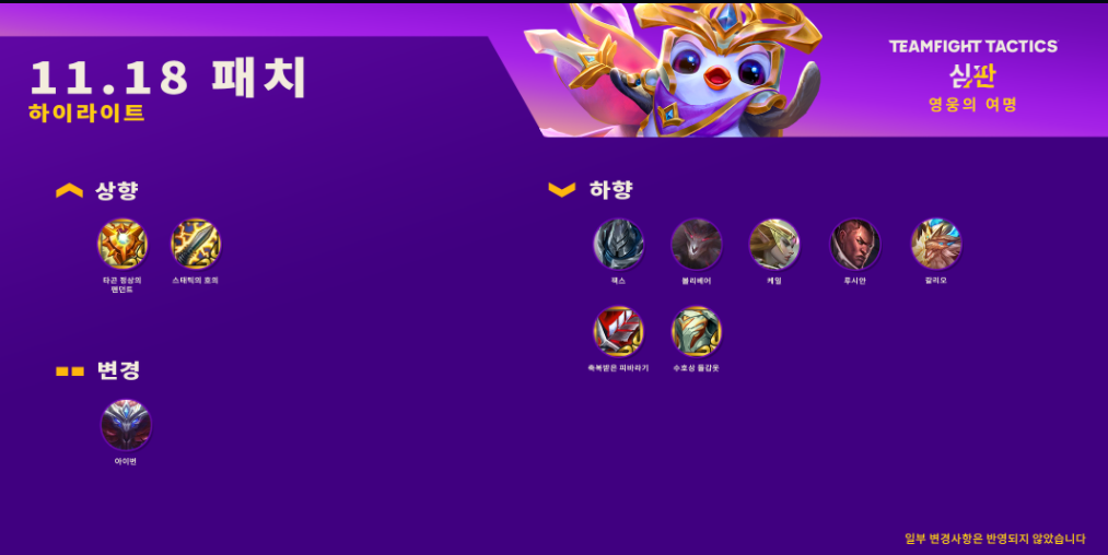 이번시간에는 롤토체스(전략적 팀 전투) 11.18 패치노트에 대해서 알아보려고 합니다. 이번 패치도 지난 패치와 마찬가지로 그렇게 큰 대규모 변화는 없지만 그래도 여러 챔피언들이 너프를 당했고 아이템 역시 변경점이 있으니 확인해두어야 실제 게임 플레이에서 더 좋은 결과를 거둘 수 있겠죠? 그렇다면 변경점들을 한번 살펴보도록 하겠습니다.
