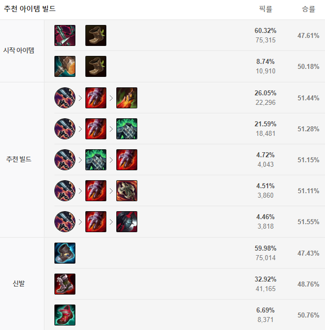 처음 시작 아이템은 강철가시 채찍과 신발로 시작해줍니다. 이후 선혈포식자를 첫 코어 아이템으로 올린 뒤 상대팀 상황을 보고 AP가 많으면 헤르메스, AD가 많으면 판금 장화를 올려주신 뒤 스테락의 도전을 올려주세요. 이후부터는 상황을 보면서 AD 챔피언들에게 너무 순삭당한다 싶으면 죽음의 무도를, AP챔피언들이 강하면 정령의 형상을, 범위 딜이 더 필요하면 굶주린 히드라를, 방어력 아이템을 많이 올렸다면 칠흑의 양날도끼를 올려주시면 됩니다.