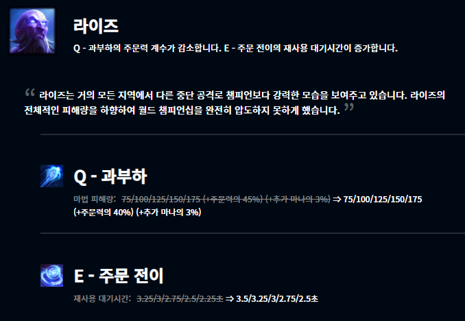 너프는 케넨, 라이즈, 소나, 소라카, 바루스로 다섯 챔피언이 그 대상입니다. 소라카같은 경우는 지난 번 패치에서 궁극기를 사용할 때 치유 감소 효과를 풀어준 뒤 회복하는 것으로 크게 버프를 받았었는데요, 덕분에 성적이 대거 올라갔습니다. 이러한 모습에 빠르게 너프를 때린게 아닌가 싶습니다. 소나의 경우는 사실 버프가 더 필요하다고 생각되는데 정작 세라핀이 버프되고 소나가 너프되는, 주객전도네요.