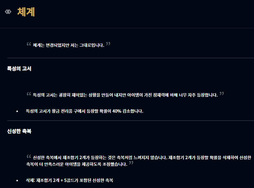 특성의 고서가 황금 전리품 구에서 등장할 확률이 40% 감소합니다. 이러한 이유로 재생술사 누누라던가, 주문술사 카르마라던가, 암살자 피들스틱과 같은 덱을 사용하기가 더욱 어려워졌습니다. 또한 라이프가 40이하가 되었을 때 나오는 신성한 축복에서 재조합기 2개와 5골드가 나오는 경우가 있었는데 사실 재조합기의 경우 그렇게 판을 뒤집기 쉬운게 아닌데다가 이게 나오면 실망하는 사람들이 더 많았죠. 이를 삭제하였습니다.
