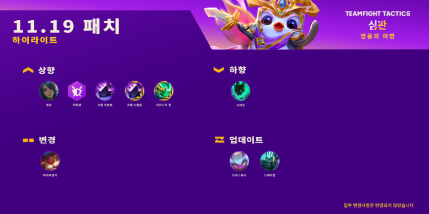 이번 시간에는 롤토체스(전략적 팀 전투) 11.19 패치노트에 대해서 알아보려고 합니다. 그렇게 큰 변화는 없으며 몇몇 특성, 챔피언이 변경되었고 체계가 살짝 바뀌었습니다. 과연 어떤 부분들이 어떤 식으로 변경되었는지 한번 정리해서 알아보도록 하겠습니다.