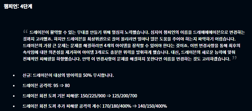롤토체스 11.19 패치에서 눈여겨봐야할 챔피언은 바로 쓰레쉬와 드레이븐입니다. 쓰레쉬의 경우 스킬을 사용하는 빈도가 줄어들게끔 패치가 되었기 때문에 크게 너프되었다고 할 수 있고, 드레이븐의 경우 신규 효과로 상대의 방어력을 50% 무시하게 되어 큰 버프라 할 수 있겠습니다. 미스 포츈도 시작 마나가 0에서 20으로 버프된 것도 버프라 할 수 있겠네요.