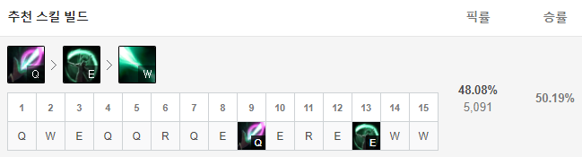 스킬은 처음 시작 3레벨에는 Q, W, E스킬을 하나씩 찍어주고 이후 4레벨부터는 R-Q-E-W 순서로 스킬을 선마해주시면 됩니다. Q스킬은 사거리가 짧지만 유일한 공격 스킬이기도 하며 거기에 R스킬과 함께 사용한다면 사거리도 멀어지며 범위도 넓어서 적들을 맞추기 쉽습니다. 데미지 또한 굉장히 강력하여 웬만한 AP챔피언 못지 않은 딜링을 뽐내죠.