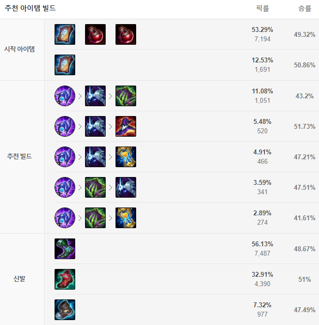 칼바람 나락 카르마 템트리는 사라진 양피지와 포션 두 개로 시작해줍니다. 이후 루덴의 폭풍을 첫 번째 코어 아이템으로 올려주며 이후 마법사의 신발, 우주적 추진력을 고정으로 올려줍니다. 그 다음부터는 상황을 보면서 상대팀이 회복, 흡혈 능력이 강하다면 모렐로노미콘을, 생존력이 필요하면 존야의 모래시계를, 딜링이 부족하다면 라바돈의 죽음 모자를, 상대팀이 마법 저항력 아이템을 많이 올렸다면 공허의 지팡이를 올려주면 되겠습니다.