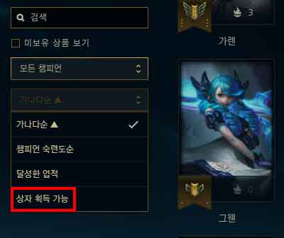 그다음 좌측 하단의 메뉴에서 '상자 획득 가능'을 눌러주세요.