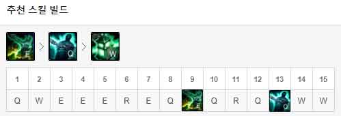 처음 시작 3레벨에는 Q, W, E스킬을 하나씩 찍어주고 4레벨부터는 E스킬이 찍으면 찍을수록 패시브 효과로 주는 추가 피해가 늘어나기 때문에, 그리고 이게 원딜 쓰레쉬의 핵심이기 때문에 먼저 마스터해줍니다. R-E-Q-W 순서로 스킬을 마스터해주면 되겠네요.