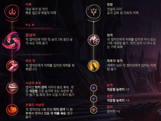 칼바람 원딜 쓰레쉬 룬은 칼날비가 제일 적합합니다. 강화 평타를 맞추고 아쉽게 죽지 않은 적들에게 바로 연이어 연속으로 평타를 두 번 더 때려서 더 확실한 킬을 만드는 것이죠. 하위 룬으로는 피의 맛, 사냥의 증표, 끈질긴 사냥꾼을 추천드리며 보조룬으로는 침착과 최후의 일격을 들어주면 됩니다.