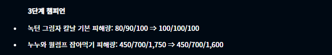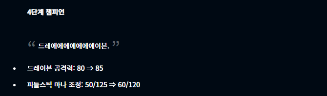 이번 11.20 패치노트에서 눈여겨서 봐야 할 챔피언 부분은 바로 1코스트 챔피언들의 너프입니다. 클레드, 카직스, 칼리스타, 베인이 너프되었는데요, 사실 최근에는 1코스트 3성을 빠르게 달성하는 덱들이 꽤나 있었습니다. 아무래도 이번 패치로 인해 이런 부분이 조금 개선되지 않을까 싶네요. 또 말하고 싶은 내용은 드레이븐인데요, 왜 계속 버프를 시켜주는지 모르겠습니다만 이제 진짜 강력한 드레이븐덱을 사용하는 사람이 많아질 듯 합니다.