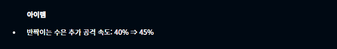 아이템에서는 반짝이는 수은의 추가 공격 속도가 40%에서 45%로 버프되었습니다.