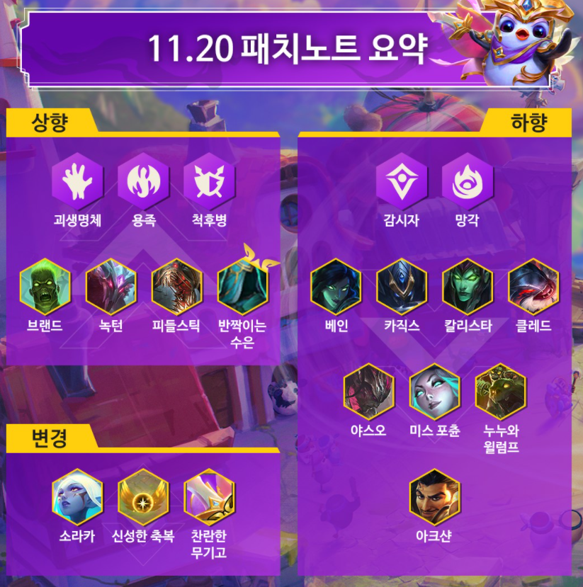 간단하게 브랜드, 녹턴, 피들스틱이 상향되었고 베인, 카직스, 칼리스타, 클레드, 야스오, 미스 포츈, 누누와 윌럼프, 아크샨은 너프되었습니다. 그 외에 3성 비에고는 크게 상향되었으며 시너지의 경우 괴생명체, 용족, 척후병 상향, 감시자와 망각은 너프되었구요, 라이프가 40 이하가 되면 나오는 신성한 축복과 또 찬란한 무기고가 변경되었습니다.