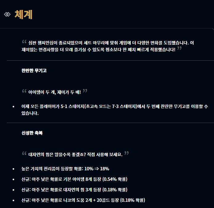 이번 롤토체스 11.20 패치의 핵심 변경점은 바로 찬란한 아이템이 두 개로 늘어난 것입니다. 찬란한 아이템은 기존에는 한 개만 얻을 수 있었는데요, 이번 패치로 인해 두 개를 얻을 수 있게 변경되었습니다. 이로 인해 굉장히 개성적이고 독창적인 플레이가 많아질 것을 예상해봅니다. 또한 라이프가 40이하로 떨어지면 등장하는 신성한 축복에서 높은 가치의 전리품이 등장할 확률이 증가하고 또 신규로 기본 아이템 8개 / 대자연의 힘 3개 / 니코의 도움 2개 + 20골드 이렇게 3가지가 추가됩니다.