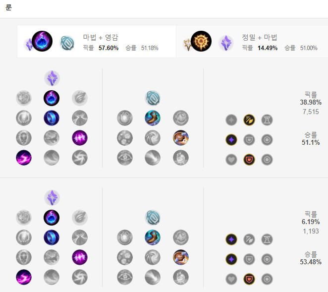 기존 미스 포츈과 다른 점은 바로 마법에서 유성 룬을 주로 사용한다는 것입니다. 초반 딜교를 유리하게 가져가는 것이죠. 또 이 미스 포츈은 평타 딜링보다 스킬 딜링에 의존하기 때문에 집중 공격을 들지 않는 것입니다. 하위 룬으로는 마나순환 팔찌, 절대 집중, 주문 작열을 들어주고 보조룬으로는 영감에서 마법의 신발과 비스킷 배달을 들어주면 됩니다.