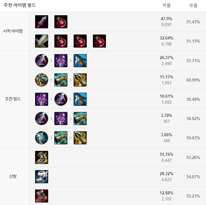 미스 포츈 템트리는 처음 도란의 검과 포션 하나로 시작해주는게 보통이고 이후 첫 코어 아이템으로 월식을 올려줍니다. 그 다음 광전사의 군화를 띄우고 요우무와 세릴다의 원한을 올려주시면 됩니다. 그 후에는 상황을 보면서 징수의 총, 수호 천사, 밤의 끝자락 등의 아이템을 올려주면 되겠습니다.