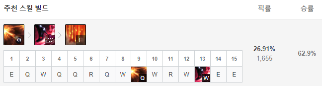 기존 미스 포츈과는 달리 1레벨에 E스킬을 찍습니다. 상대 원딜에게 E스킬을 사용하면 데미지는 물론 유성 룬으로 유성 데미지까지 추가로 입힐 수 있죠. 그 다음 2레벨에는 Q, 3레벨에는 W를 찍어준 뒤 R-Q-W-E 순서로 스킬을 마스터해주시면 되겠습니다.