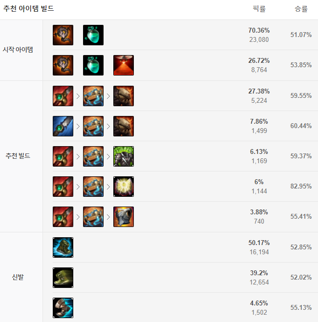 우선 체력을 올려주는 정글템을 맞춰준 뒤 마법공학 벨트까지는 고정이며, 템을 올리는 중간에 돈이 여유가 되면 기본 신발, 또 본인이 한 번도 안 죽은 상태면 암흑의 인장을 올려주시는 것도 좋은 선택입니다.