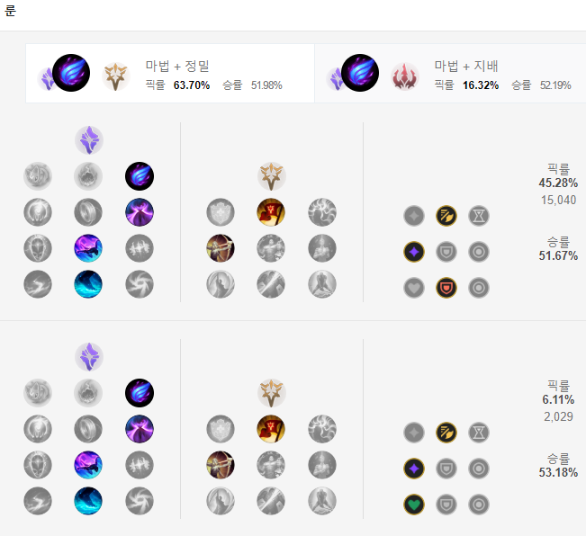 그 외에는 이동속도와 관련된 빛의 망토, 기민함, 물위를 걷는 자 룬을 들어주시고 보조룬에는 정밀의 승전보와 민첩함을 들어서 다이브 혹은 죽을 위기에서 승전보때문에 사는 경우를 노리면 되겠습니다.