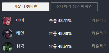 특히나 초반에 카정을 당하면 상대 정글러는 또 다시 카정을 오고 그러면 또 죽거나 도망치면서 동선도 꼬이기 마련이라 초반에 굉장히 강력한, 카정을 많이 즐기는 타입의 육식형 정글러들이 카운터라고 생각합니다.