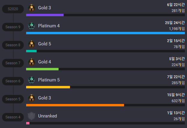 과거 다른 닉네임을 사용하셨더라면 제대로 된 정보가 나오지 않을 수도 있는데요, 저 같은 경우도 닉네임을 여러번 바꾸었기 때문에 저기서 나온 정보가 맞는 정보가 아니였습니다. 시즌4때는 골드였고, 시즌5때 플레티넘, 시즌6 골드 등이였는데 해당 기록에는 잘못된 랭크들이 나오는 것으로 보아 아마 저 이전에 저와 같은 닉네임을 사용했던 사람들의 티어를 보여주는 것 같습니다. 즉, 닉네임을 변경한 적이 있다면 그 이후부터의 기록이 남으며, 과거에 같은 닉네임을 사용했던 사람이 있으면 이전 시즌들은 무언가가 잘못 기록되어 있을 수도 있다는 말이죠.