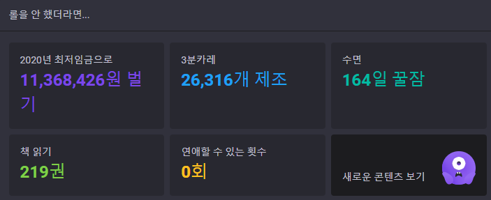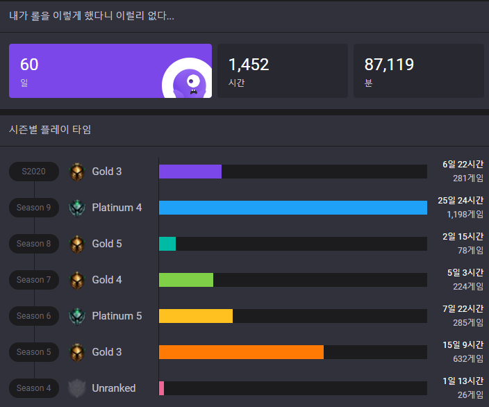 롤은 한지는 60일이 되었다고 나오고 플레이 타임은 1,452시간으로 나오며 아래에 '롤을 안 했더라면...'메뉴로 이때까지 플레이한 롤 시간을 최저임금으로, 3분카레로, 수면으로, 책 읽기로, 연애할 수 있는 횟수로 추가적으로 재미있는 내용들을 알려줍니다. 롤을 본인이 오래했다 싶으신 분들은 한번 재미로 가볍게 이용해보시는 것을 추천드립니다.