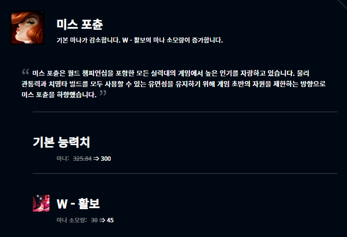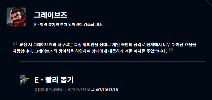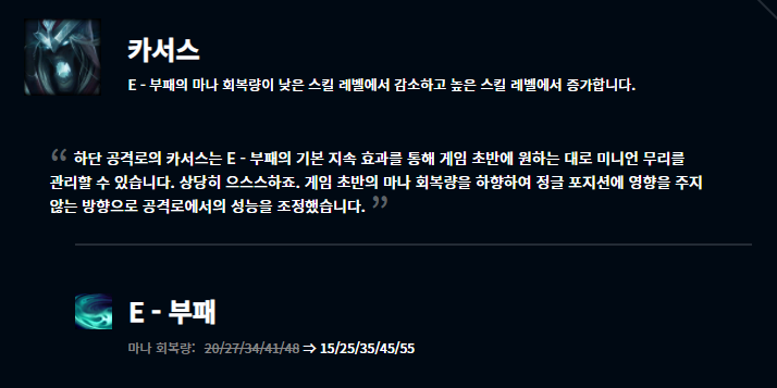 최근 소환사의 협곡에서 굉장히 자주 보였던 아크샨, 그레이브즈, 미스 포츈은 너프를 당할만 했다고 생각됩니다. 아크샨의 경우에는 밴을 많이 당해서 못나오기도 했지만 그레이브즈와 미스 포츈은 아니었죠. 카서스 너프의 경우 원딜로 사용하면서 게임 초반 미니언 라인을 관리하는 식으로 사용되었던게 좀 아니었는지 E스킬의 마나 회복량을 손댔습니다. 카서스로 정글을 운용하는데 있어서는 그렇게 큰 문제는 아니라 생각되네요.