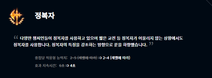 정복자 시대가 끝나려고 하는 것일까요? 굉장히 많은 챔피언들이 사용하는 정복자 룬이 너프를 당했습니다. 중첩당 능력치도 너프되었고 지속 시간도 더 짧아진 모습입니다. 또한 탱커형 서포터들이 많이 드는 수호자 역시 약간 하향되었으며, 지배 하위룬인 굶주린 사냥꾼 역시 그 능력을 하향했습니다. 영리한 사냥꾼의 경우 사실 과거 AP 메이지들이 빙결 강화를 들었을 때 굉장히 유행했었는데요, 당시에는 GLP, 쌍둥이 그림자, 존야의 모래시계까지 액티브 스킬을 가진 아이템을 세 개나 올렸기 때문이라 생각되네요. 빙결 메타가 종료되고 과연 영리한 사냥꾼을 드는 챔피언이 얼마나 있는지 의문입니다. 그렇기에 영리한 사냥꾼 버프는 마법공학 벨트와 존야의 모래시계를 올리는 챔피언을 제외하고 아직까지는 있으나 마나라고 생각되며 체력 룬 파편의 경우 수치가 상향되었습니다.