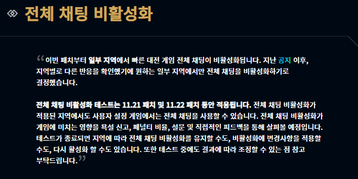 전체 채팅 비활성화는 완벽하게 삭제된 것이 아니라 11.21 패치, 11.22 패치동안 적용되며 그 이후 어떻게 할지 판단할 것이라 합니다. 우리나라 서버의 경우 전체채팅으로 인한 욕설 및 비난, 인격모독행위가 굉장히 많지만 북미서버의 경우 이러한 것들이 상대적으로 덜하고, 그로 인해 이번 전체 채팅 비활성화에 대해 굉장히 부정적이라고 합니다. 과연 어떻게 될지 모르겠으나 많은 유저들이 반대하는 것으로 보아 다시 전체채팅 기능이 돌아올 것이라 생각되네요.