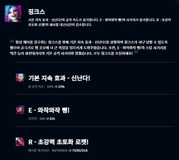 먼저 11.21 패치에서 버프된 챔피언은 징크스, 럭스, 사이온, 티모, 비에고, 자야이며 너프된 챔피언은 아크샨, 그레이브즈, 카서스, 미스 포츈, 퀸입니다. 또 아이템 부분에서는 선혈포식자, 강철가시 채찍, 발걸음 분쇄기가 변경되었고 룬 부분에서는 정복자, 수호자, 굶주린 사냥꾼, 영리한 사냥꾼, 체력 룬 파편에 변경이 있었습니다. 구체적인 부분까지 알아봅시다.